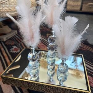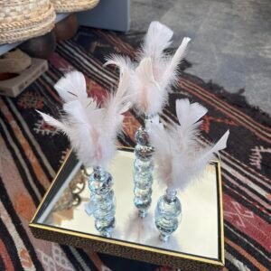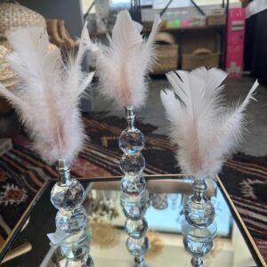 Bu ürün, zarafeti ve estetiğiyle dikkat çeken özel bir dekoratif objedir. Üçlü alt bölümü kristal kesim cam üstü tüy, modern ve şık bir tasarıma sahip olup, her detayıyla özenle işlenmiştir.